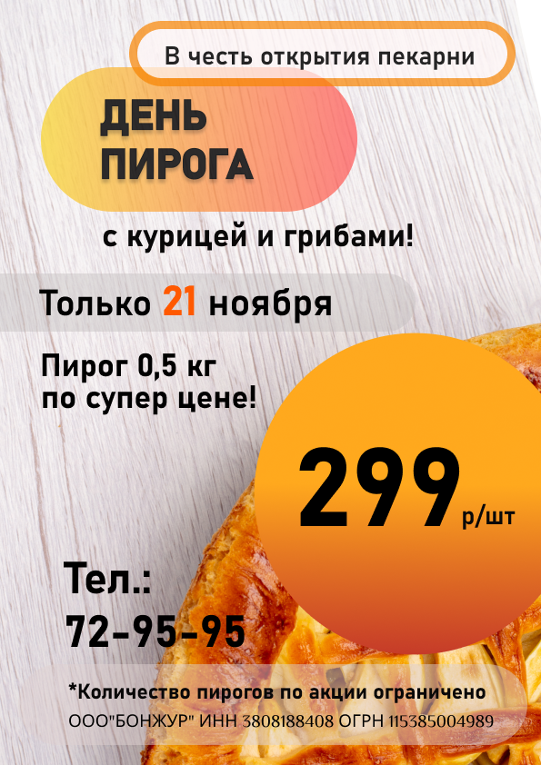 Спешим порадовать! В честь открытия пекарни «БонЖур» 21 ноября мы объявляем «ДНЁМ ПИРОГА»! Только один день, 500 сочных пирогов с курицей и грибами по 0,5 кг по супер цене! Всего 299 рублей за пирог! Успейте купить, пока они не закончились!